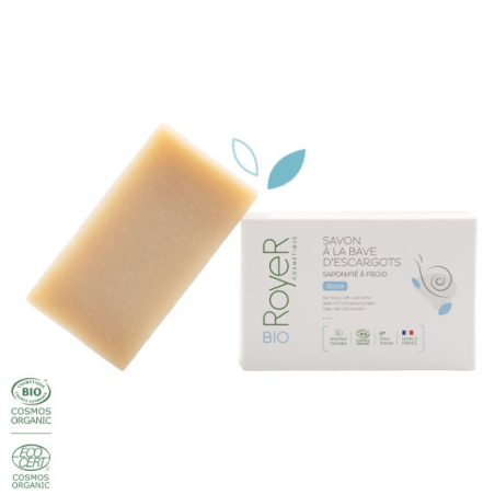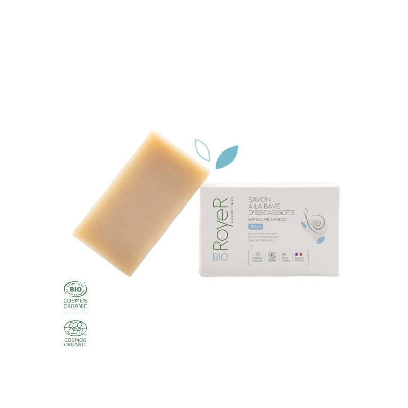 Composé avec 5% de bave d'escargot bio fraîche et de l'huile de coco bio, le Savon Royer Cosmétique nettoie en douceur, hydrate, nourrit, répare et protège votre peau.