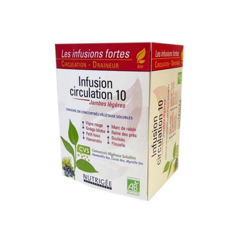 Pour retrouver des jambes légères et toniques, l'infusion circulation 10 de Nutrigée contient 10 plantes bio à double action, circulatoire et drainante :